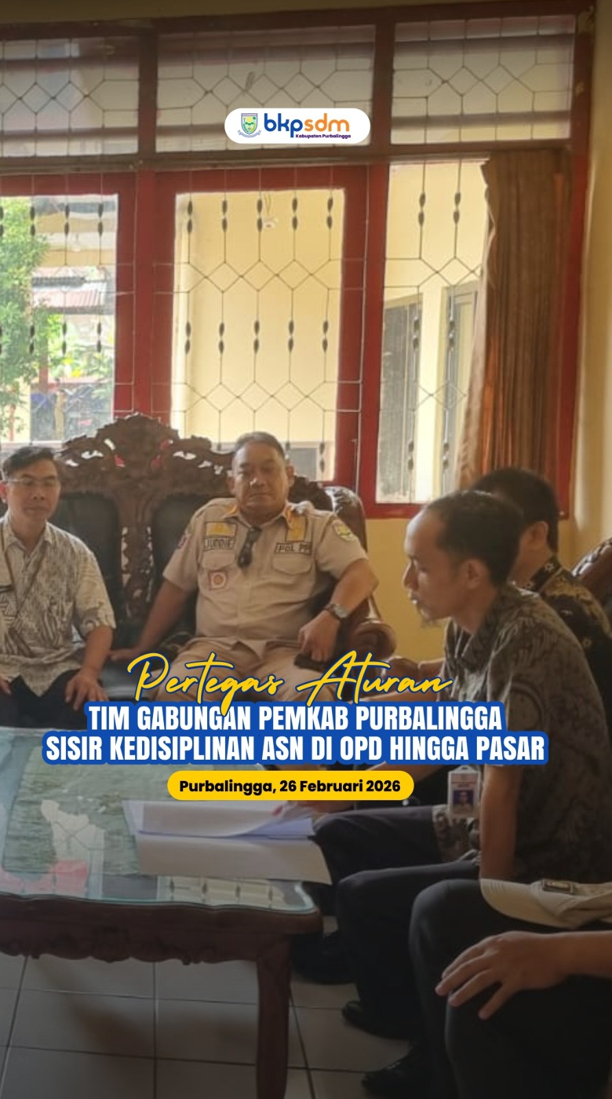 Langkah tegas ini merupakan tindak lanjut dari Keputusan Sekda Nomor: 800.1.6.2/19 Tahun 2026 tentang Pembentukan Tim Pemantauan Disiplin ASN di Lingkungan Pemerintah Kabupaten Purbalingga. Tim gabungan ini terdiri dari lintas instansi, yaitu: